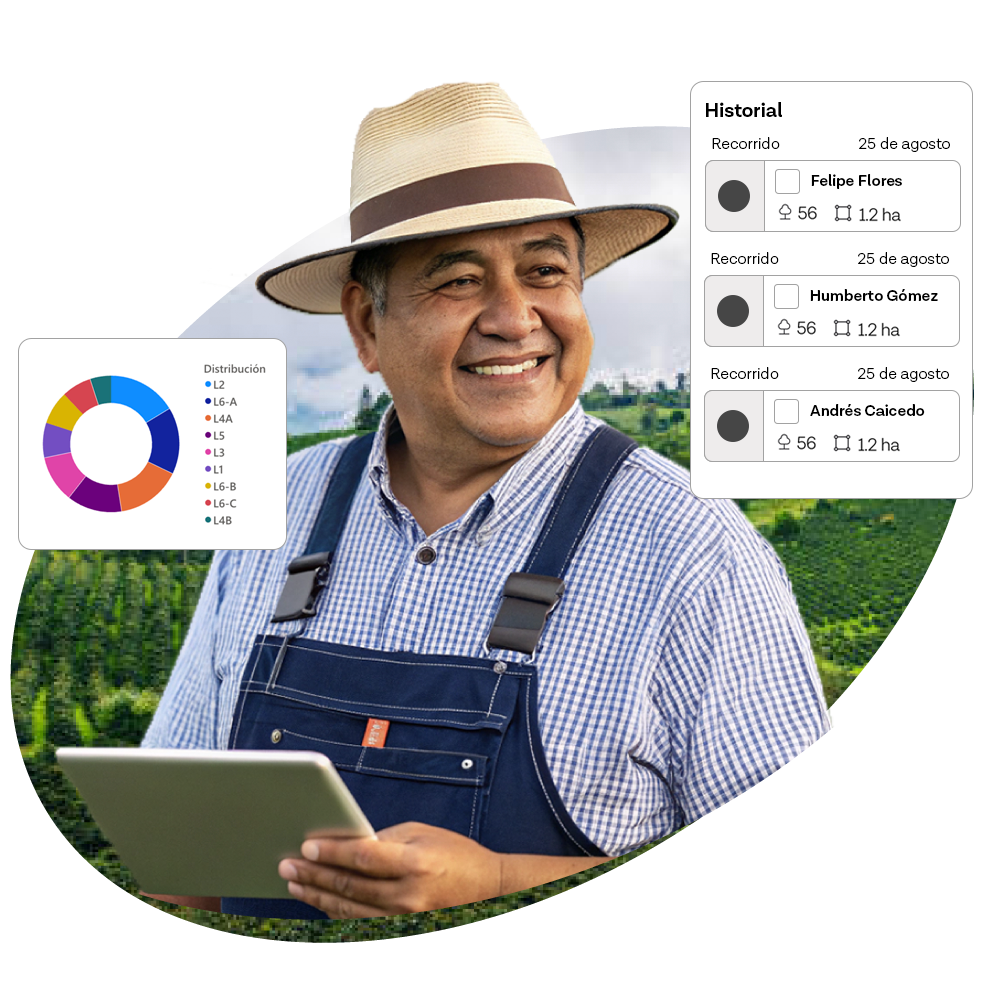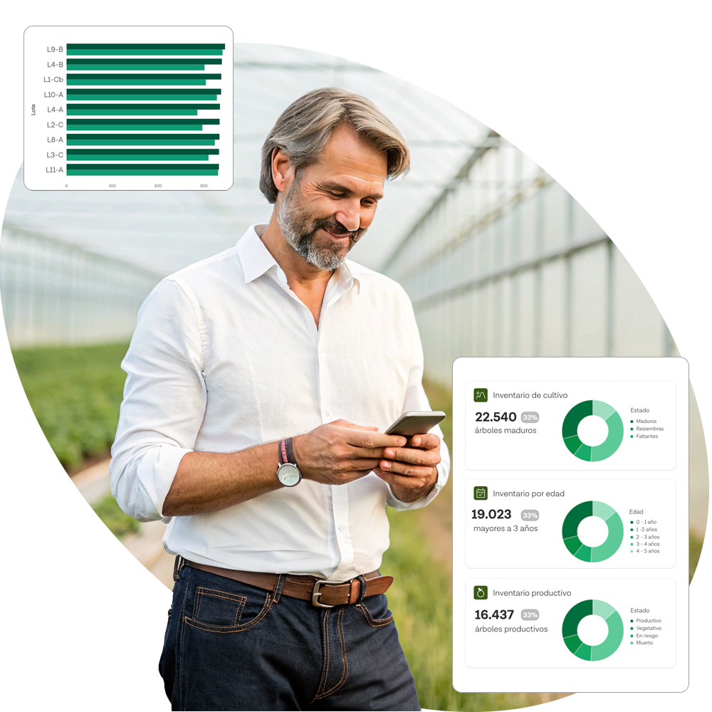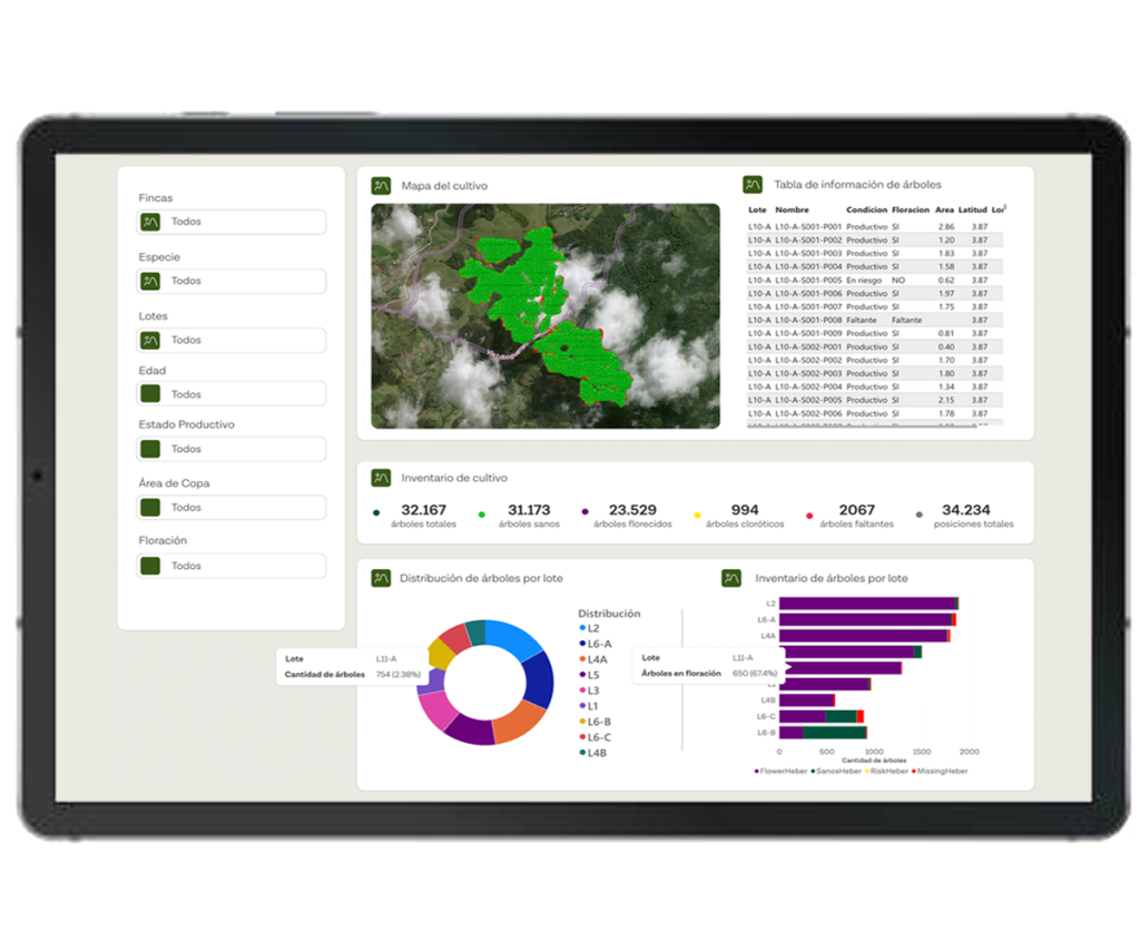 Administra tus lotes, líneas de siembra y árboles con información precisa y herramientas visuales que te permiten hacer seguimiento a la evolución de tu proyecto.